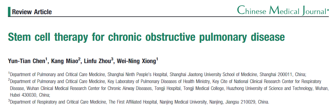 2012年7月發(fā)表在《中醫(yī)學(xué)雜志》上由上海交大九院?陳云田、?熊偉寧、同濟(jì)醫(yī)院?國(guó)家呼吸系統(tǒng)疾病臨床醫(yī)學(xué)研究中心、武漢市慢性氣道疾病臨床醫(yī)學(xué)研究中心苗康,?南京醫(yī)科大學(xué)第一附屬醫(yī)院周林甫,聯(lián)合發(fā)表了一項(xiàng)研究《干細(xì)胞治療慢性阻塞性肺疾病》綜述了歷年來(lái)。間充質(zhì)干細(xì)胞(MSCs)治療COPD已發(fā)表的臨床研究的結(jié)果,分析了不同種類(lèi)的干細(xì)胞、不同的細(xì)胞來(lái)源、不同的給藥方式和劑量來(lái)治療COPD的結(jié)果 。結(jié)論為安全并且表現(xiàn)正面的效果。