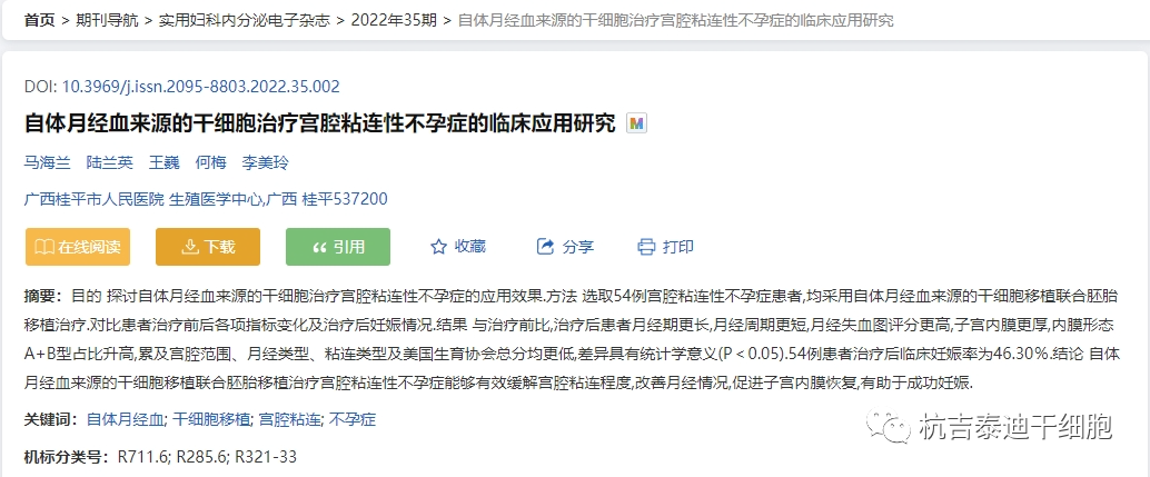 近期,廣西桂平市人民醫(yī)院發(fā)表了一項(xiàng)《自體月經(jīng)血來源的干細(xì)胞治療宮腔粘連性不孕癥的臨床應(yīng)用研究》,該發(fā)表在實(shí)用婦科內(nèi)分泌電子雜志上。