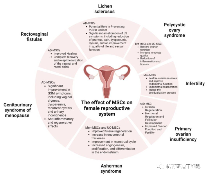 干細(xì)胞在醫(yī)學(xué)領(lǐng)域的潛力是極其積極的(下圖)。通過再生、分化、免疫調(diào)節(jié)、血管生成、抗氧化、抗凋亡等機(jī)制,它們帶來了新的治療模式并成功治療了許多疑難疾病。特別是在婦科領(lǐng)域,這些病癥的例子包括不孕癥、多囊卵巢綜合征、阿謝曼綜合征、GSM、直腸陰道瘺、硬化性苔蘚和卵巢早衰。