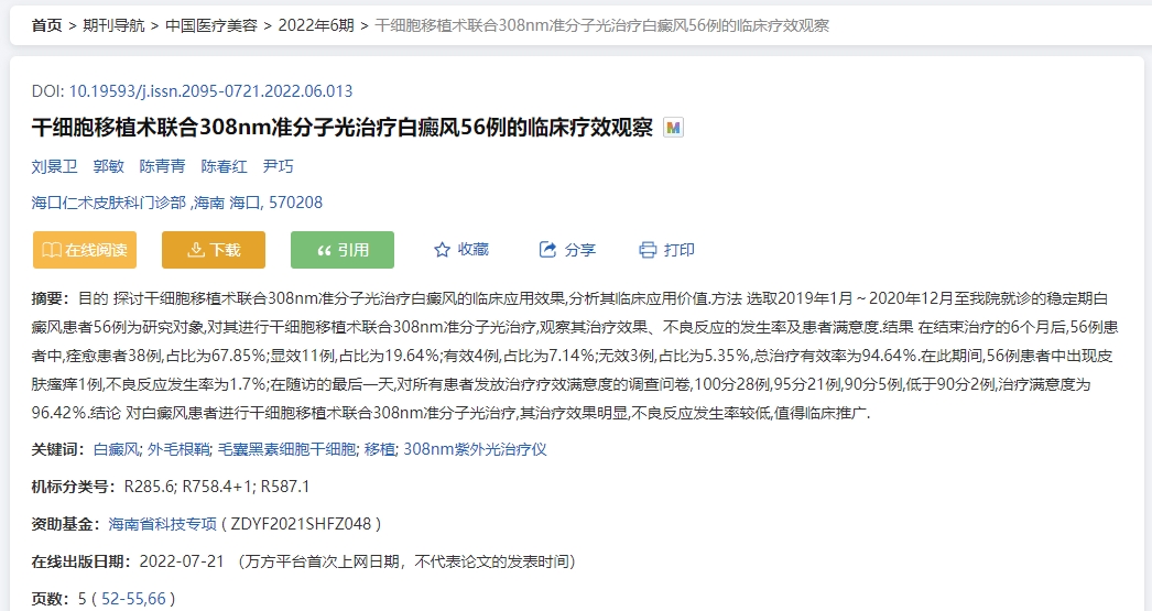 2022年,《中國醫(yī)療美容》期刊發(fā)表了一篇《干細(xì)胞移植術(shù)聯(lián)合308nm準(zhǔn)分子光治療白癜風(fēng)56例的臨床療效觀察》的文章,目的:探討干細(xì)胞移植術(shù)聯(lián)合308nm準(zhǔn)分子光治療白癜風(fēng)的臨床應(yīng)用效果,分析其臨床應(yīng)用價值。