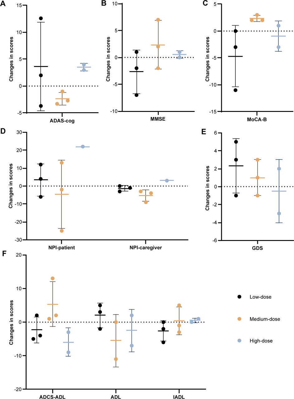中等劑量組受試者阿爾茨海默病評(píng)估量表-認(rèn)知部分(ADAS-cog)評(píng)分在第12周下降了2.33,蒙特利爾認(rèn)知評(píng)估基礎(chǔ)量表(MoCA-B)評(píng)分增加了2.38,表明認(rèn)知功能有所改善。