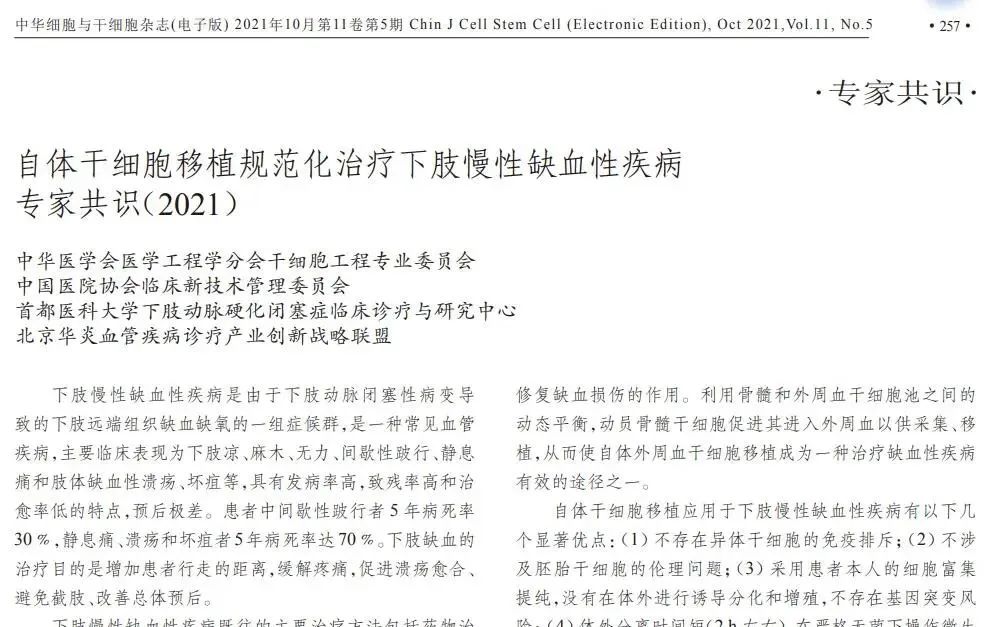2021年10月在《中華細胞與干細胞雜志( 電子版》(第11第5期 上發(fā)表的《自體干細胞移植規(guī)范化治療下肢慢性缺血性疾病專家共識( 2021)》,其中提到,自體干細胞移植對下肢慢性缺血性疾病治療的安全性和有效性已成為學(xué)界公認。