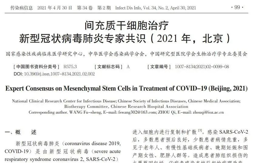 2021年,《傳染病信息)》 雜志發(fā)表了我國首個《間充質(zhì)干細胞治療新型冠狀病毒肺炎專家共》對間充質(zhì)干細胞治COVID-19提出了建議,包括了患者的選擇、細胞輸注的準(zhǔn)備、細胞輸注的監(jiān)測和不良反應(yīng)處理、療效評價指標(biāo)等。