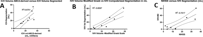 a,通過模型1ABC/2派生方法與vol模型 2(分割)進(jìn)行的神經(jīng)影像ICH vol的線性回歸。b、IVH通過模型1和定量分割模型2方法對Graeb進(jìn)行了修改。c,出血量和NIHSS評分與IVH量通過分割進(jìn)行比較。