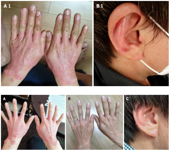 圖:A1,B1為治療前,A治療后15天,B、C治療后122天,可見紅斑已消退在治療過程中,該患者未出現(xiàn)包括皮炎、發(fā)燒、發(fā)冷或惡心等不良反應(yīng),證實了間充質(zhì)干細(xì)胞治療的安全性和有效性。