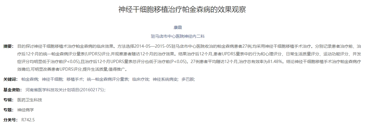 同年,駐馬店市中心醫(yī)院神經(jīng)內(nèi)二科在中國(guó)知網(wǎng)發(fā)表了“神經(jīng)干細(xì)胞移植治療帕金森病的效果觀察”的文章[1]。