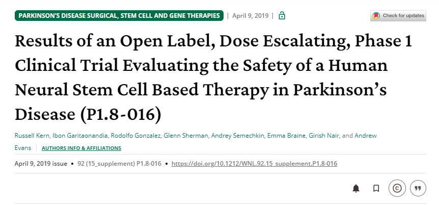 2019年4月9日,美國(guó)多家干細(xì)胞公司聯(lián)合在《Neurology》上發(fā)表了一篇名為《一項(xiàng)開(kāi)放標(biāo)簽、劑量遞增的1期臨床試驗(yàn)結(jié)果,該試驗(yàn)評(píng)估了基于人類神經(jīng)干細(xì)胞的療法在帕金森病中的安全性 (P1.8-016)》的研究成果。[3]