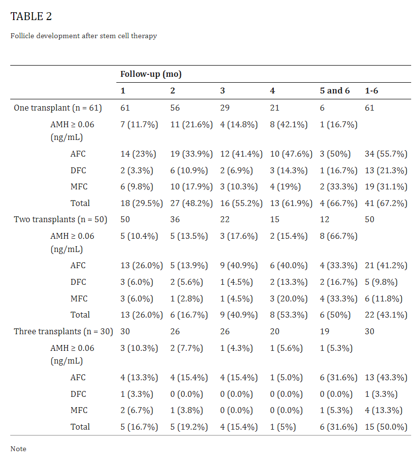 通過(guò)超聲引導(dǎo)下經(jīng)陰道注射將臍帶間充質(zhì)干細(xì)胞移植給患者,結(jié)果定義為干細(xì)胞治療后每月成熟卵母細(xì)胞的數(shù)量(表2)。所有患者均接受了第一輪手術(shù);但部分患者未能接受第二輪和第三輪移植,導(dǎo)致數(shù)例失訪。術(shù)后每月收集AMH、竇卵泡(AFC)、優(yōu)勢(shì)卵泡數(shù)(DFC)和成熟卵泡數(shù)(MFC)的數(shù)據(jù)。特別是,我們只能在第一次移植五個(gè)月后獲得六名患者的結(jié)果;因此,我們將第5個(gè)月和第6個(gè)月的數(shù)據(jù)整合到一個(gè)項(xiàng)目中以更加直觀。