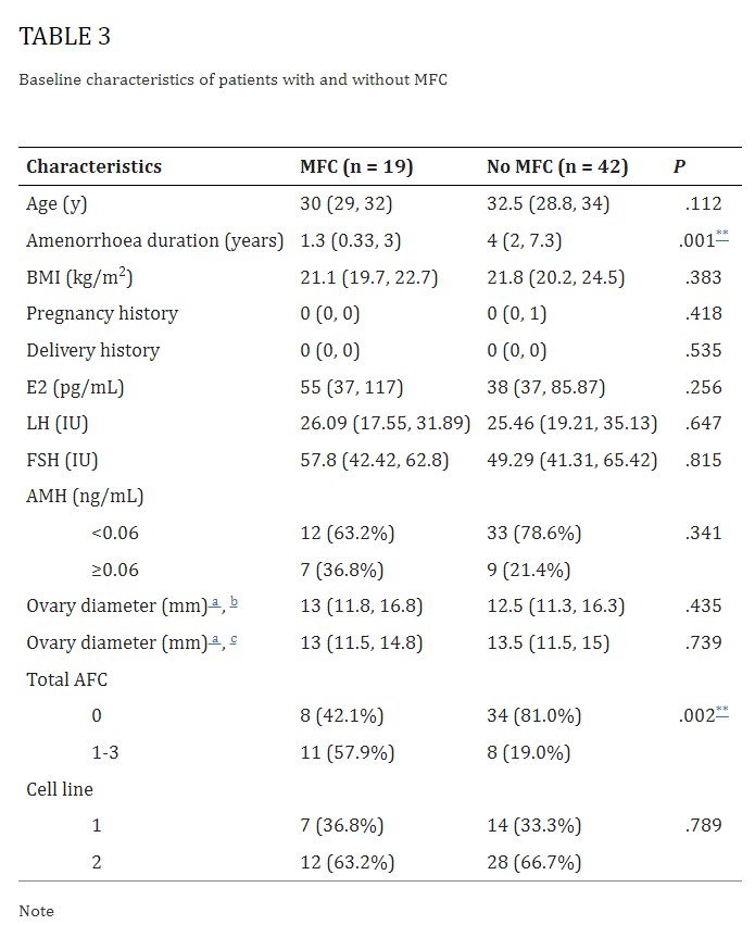 為了確認(rèn)治療效果與治療之前之間的關(guān)系,我們比較了19名在UCMSC注射后獲得成熟卵泡的患者和其他 42名未發(fā)育成熟卵泡的患者的基本臨床特征。MFC患者的中位年齡為30歲,閉經(jīng)持續(xù)時(shí)間為1.3年。這些MFC患者的E2血激素水平有高于無(wú)MFC組的趨勢(shì),兩組之間LH和FSH水平?jīng)]有差異。作為卵巢儲(chǔ)備的有效指標(biāo),還測(cè)試了AMH水平。總體而言,MFC組36.8%的AMH水平≥0.06ng/mL,而無(wú)MFC組的比例為 21.4%。