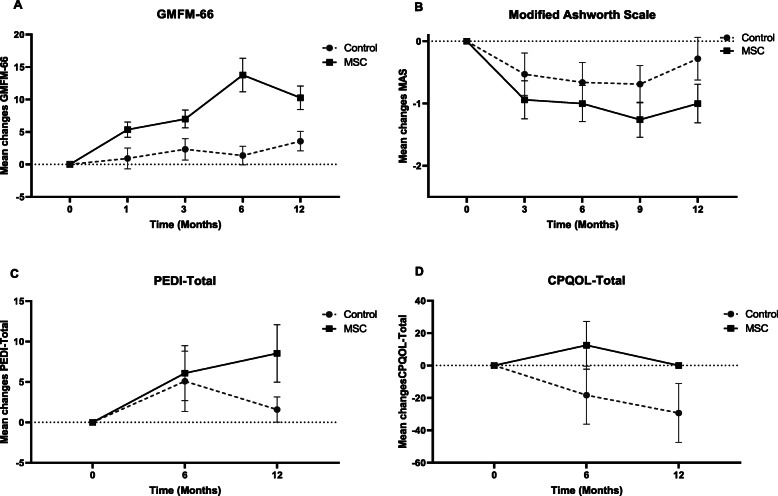 每組有36名參與者。與基線和對照組相比,臍帶間充質(zhì)干細(xì)胞移植組干預(yù)12個(gè)月后的平均GMFM-66評分顯著更高。PEDI總分也有所增加。