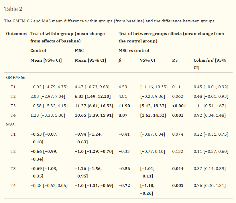 其他量表的評估顯示,從基線到細(xì)胞注射后12個(gè)月的平均MAS評分顯著下降((圖4B),并且臍帶間充質(zhì)干細(xì)胞移植組的平均變化在統(tǒng)計(jì)學(xué)上高于具有較大效應(yīng)量的對照組(表2)。