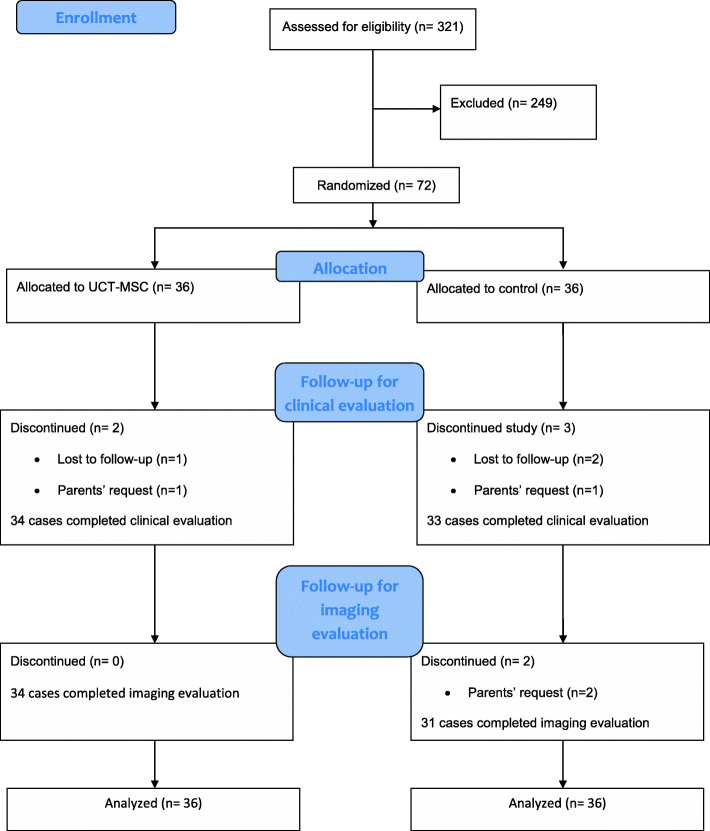 患有痙攣性CP的參與者(4-14歲)按1:1的比例分配接受UCT-MSC或假手術(shù)。實(shí)驗(yàn)組給予單劑量(2×107)細(xì)胞。在假對照臂中對下背部進(jìn)行小針刺。所有人都被鎮(zhèn)靜以防止意識。