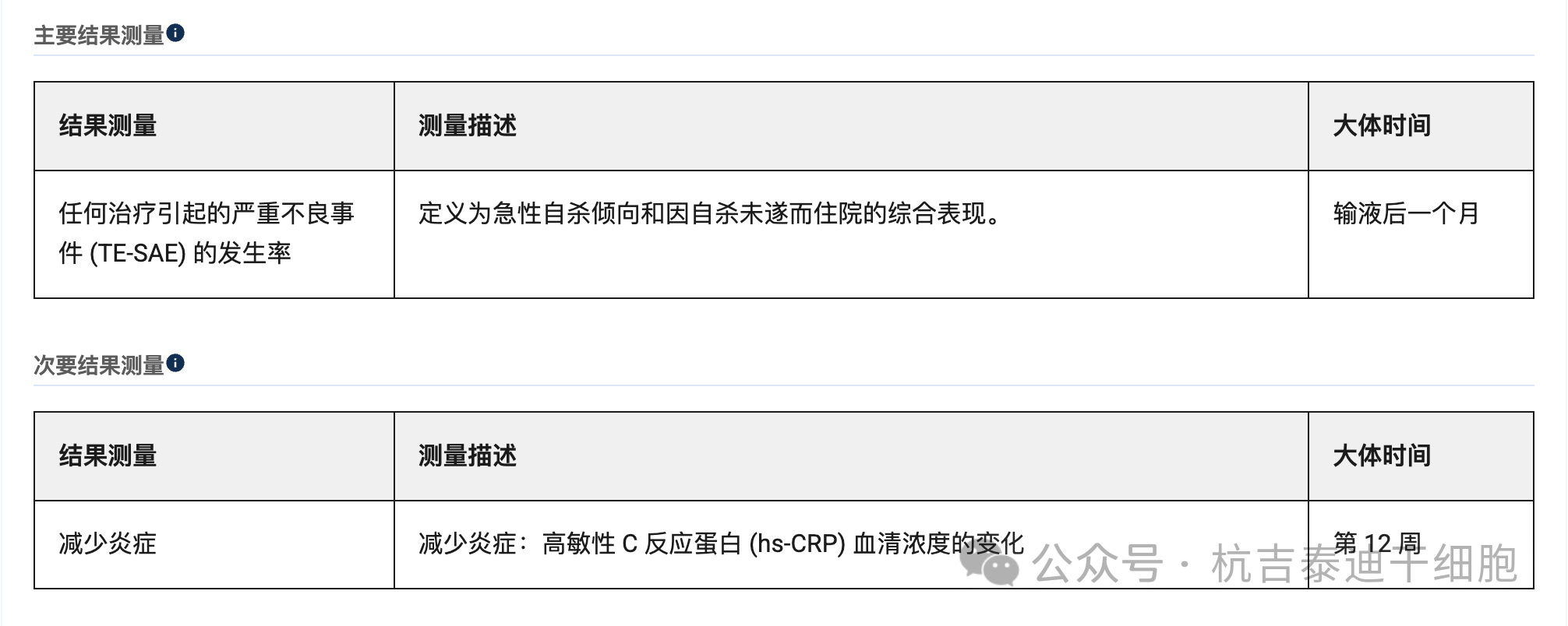 正式名稱:一項(xiàng)I期前瞻性、隨機(jī)、雙盲、安慰劑對照試驗(yàn),旨在評估同種異體人類間充質(zhì)干細(xì)胞輸注與安慰劑對難治性抑郁癥患者的安全性和潛在療效。