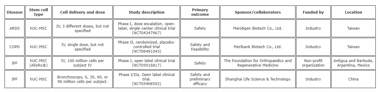 表1:ClinicalTrials.gov上列出的正在進(jìn)行和當(dāng)前正在招募的研究,研究使用MSCs治療肺部疾病。