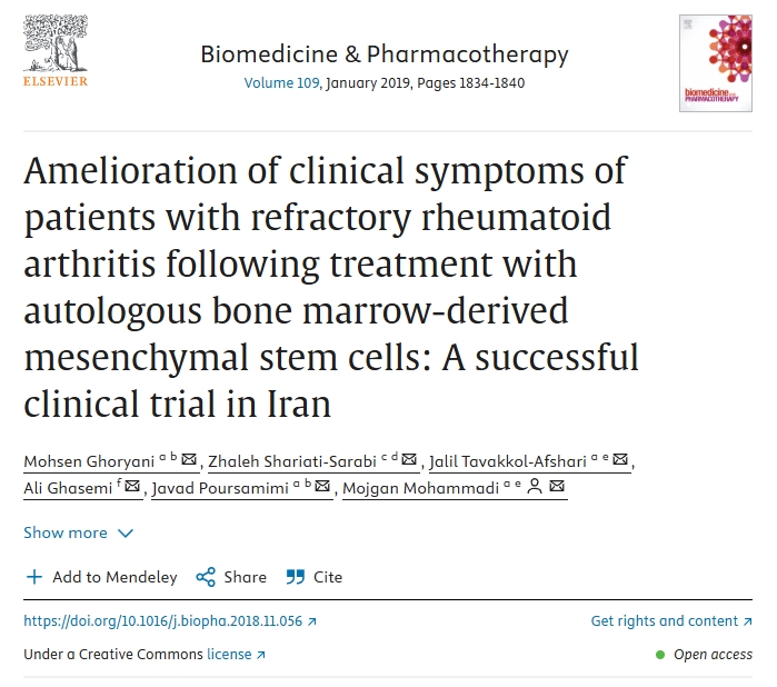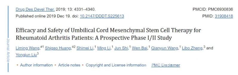 2019年,伊朗科研人員在期刊雜志《生物醫(yī)學與藥物治療學》上發(fā)表了一篇“自體骨髓間充質(zhì)干細胞治療后難治性類風濕性關節(jié)炎患者臨床癥狀改善的臨床試的文章。