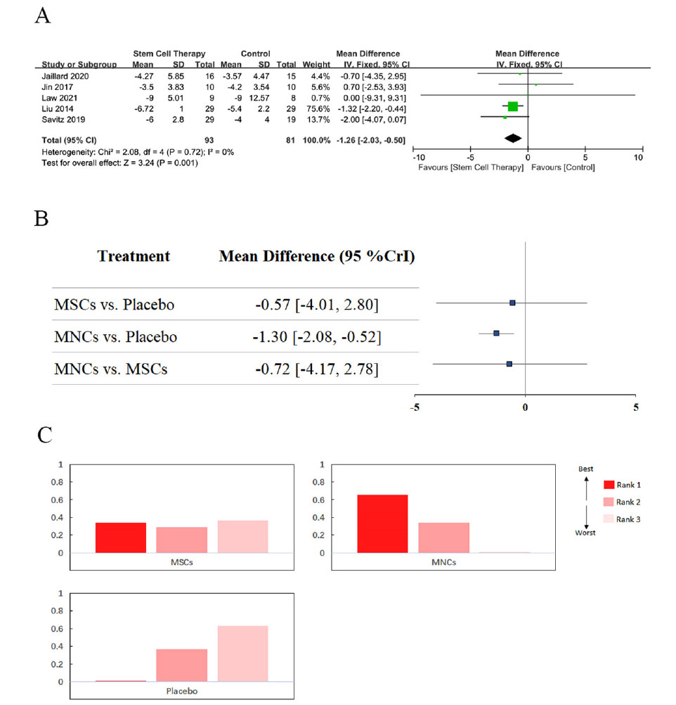 (A) 直接薈萃分析中 mRS 評分變化的森林圖。(B) 網(wǎng)絡薈萃分析中 mRS 評分變化的森林圖。(C) 不同類型干細胞移植的排序位置。MSCs 和 MNCs 的 SUCRA 分別為98%和26%。