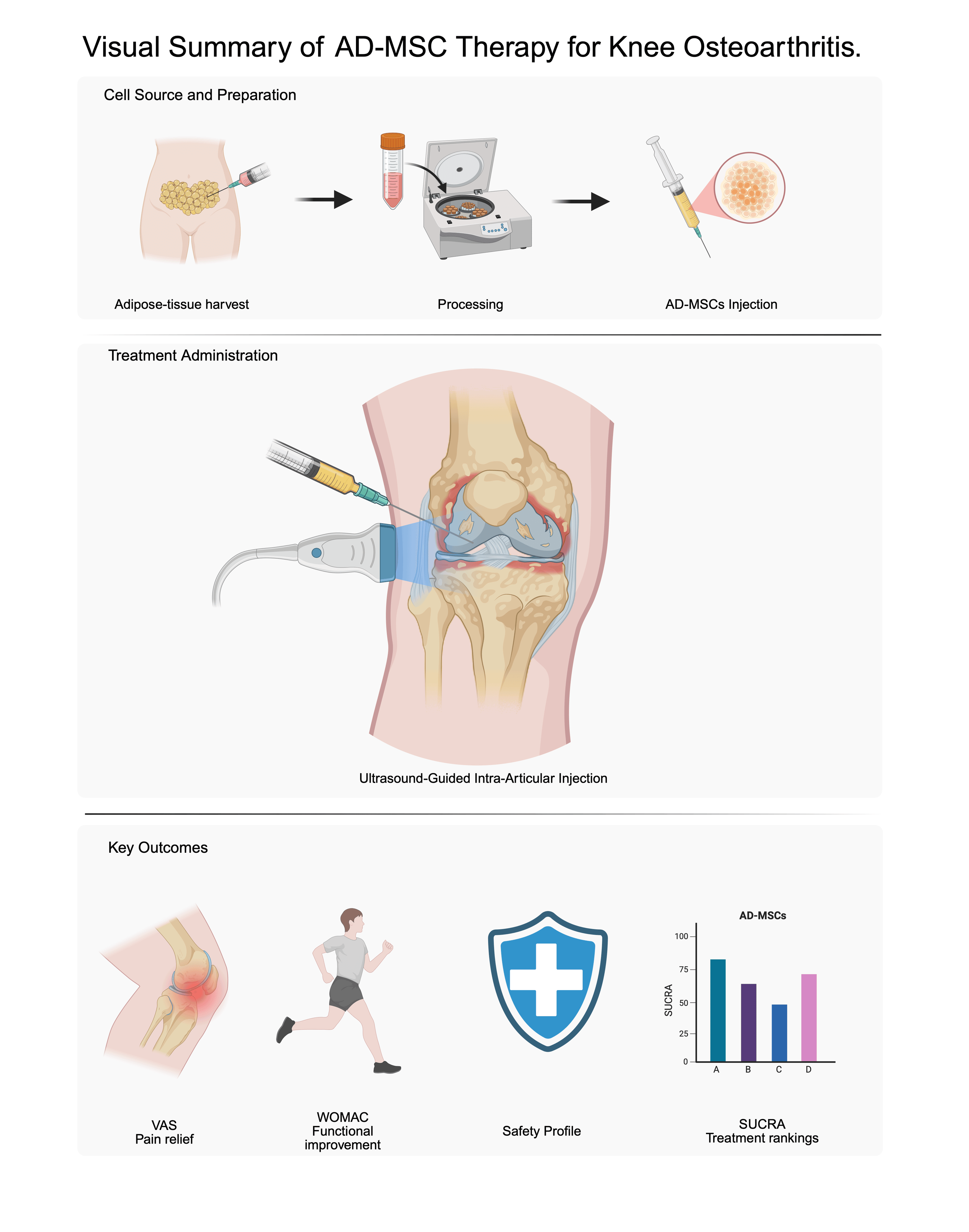 自體和異體間充質(zhì)干細(xì)胞 (AD-MSC) 之間的選擇應(yīng)以治療目標(biāo)和臨床情況為指導(dǎo)。高劑量自體AD-MSC在所有時(shí)間點(diǎn)均表現(xiàn)出更強(qiáng)效、更持續(xù)的疼痛緩解效果,使其成為尋求快速控制癥狀的患者的理想選擇。相比之下,高劑量異體AD-MSC在6個(gè)月和12個(gè)月時(shí)的功能改善排名更高,表明其具有更佳的長(zhǎng)期再生效果。實(shí)際因素也會(huì)影響臨床決策。自體 AD-MSC需要從患者體內(nèi)采集和處理,這可能會(huì)增加手術(shù)負(fù)擔(dān)、成本和治療延遲。同時(shí),異體AD-MSC具有現(xiàn)成的便利性,更容易獲取,并可能具有更廣泛的可擴(kuò)展性。