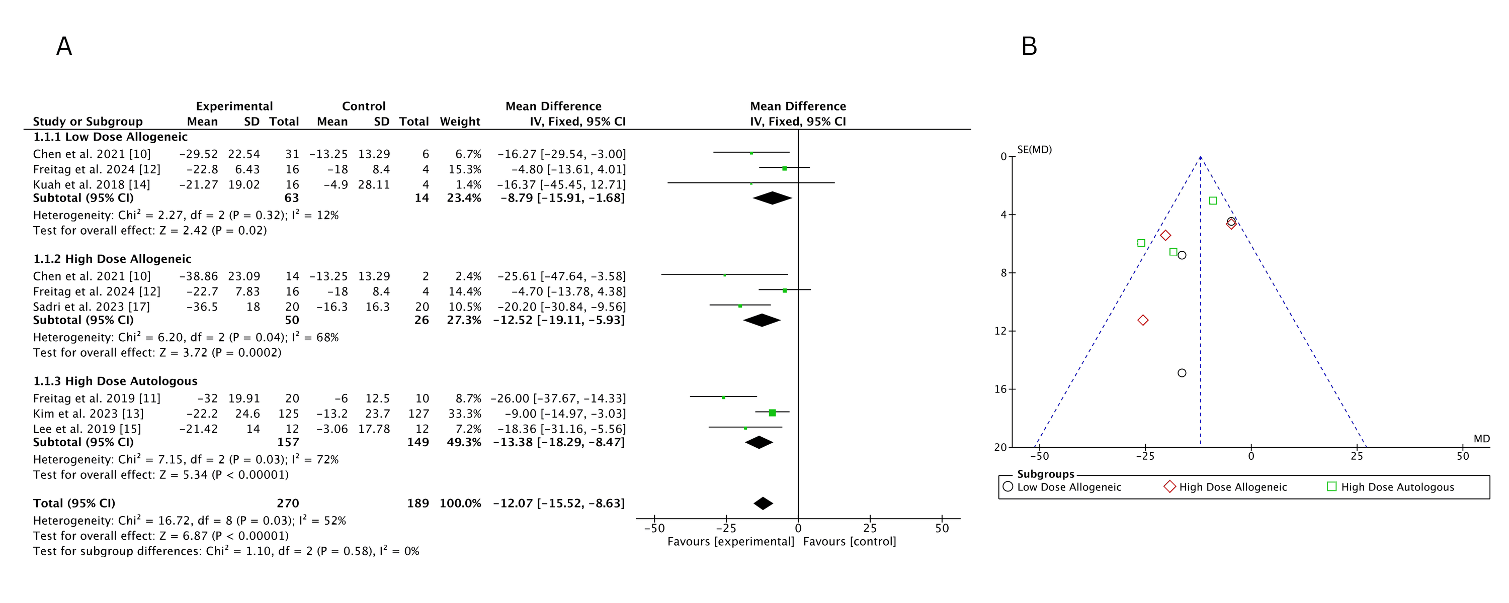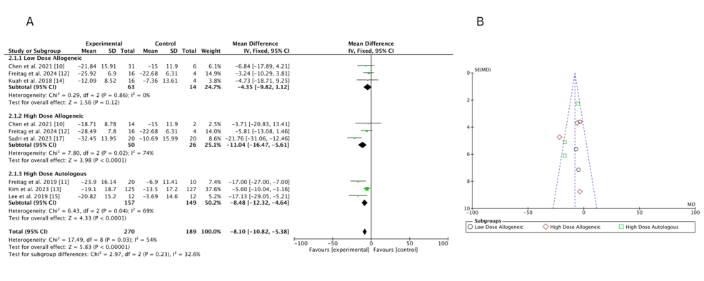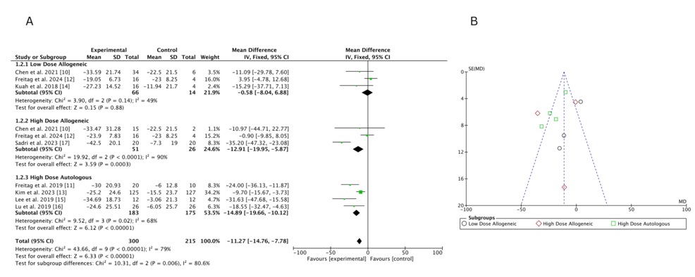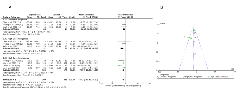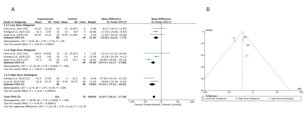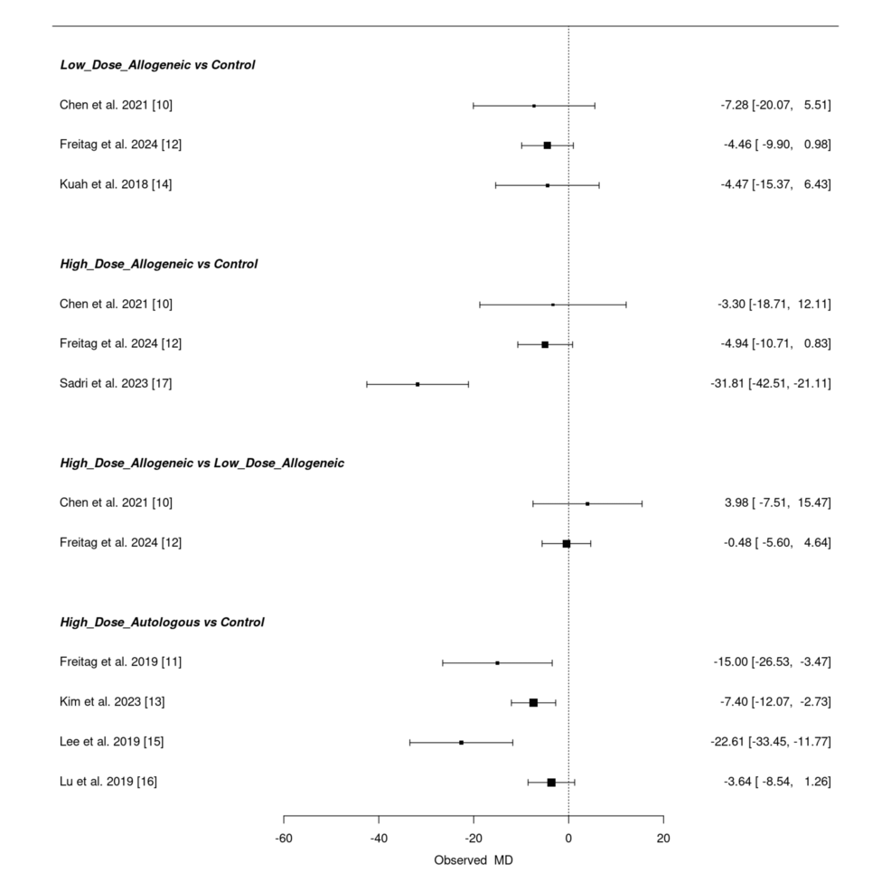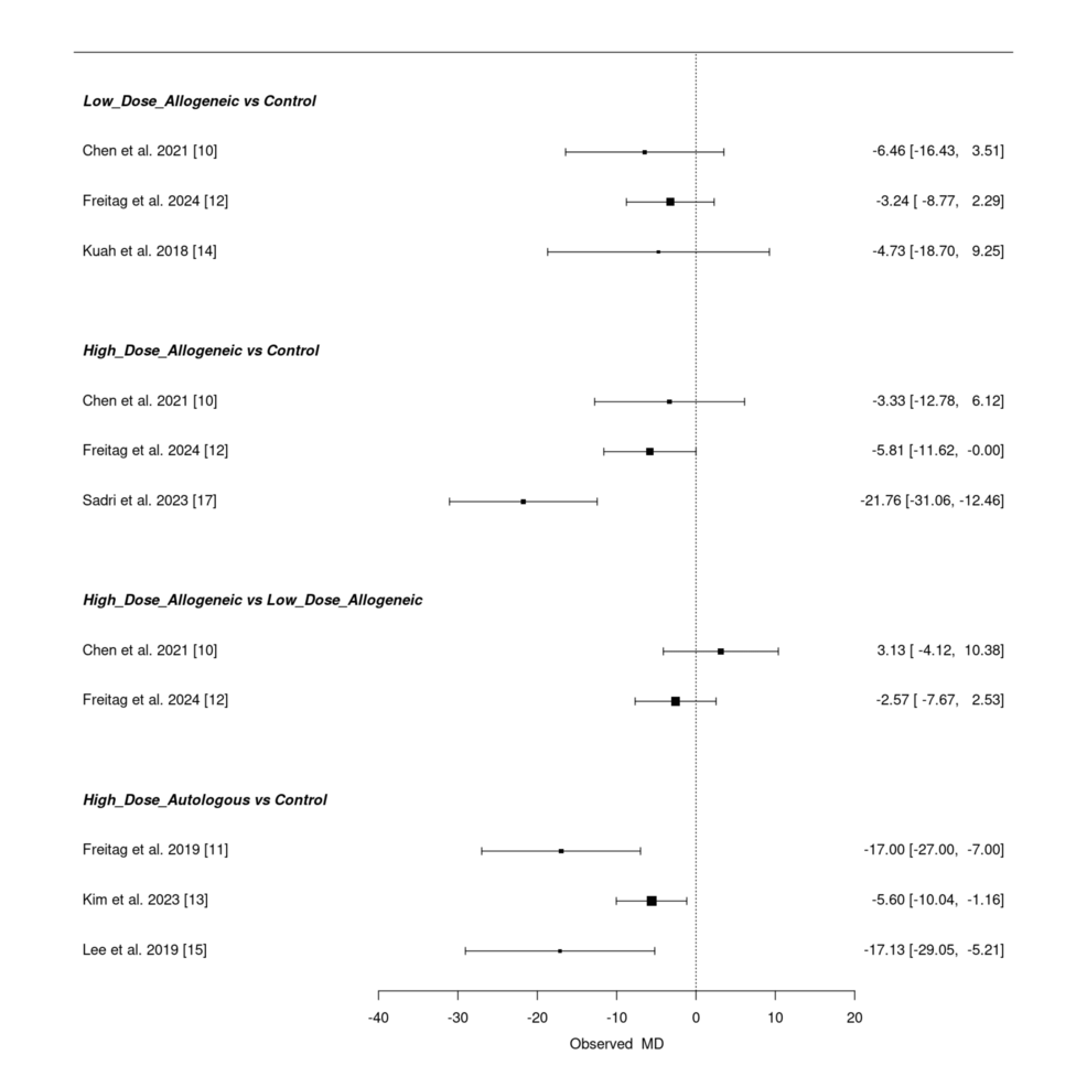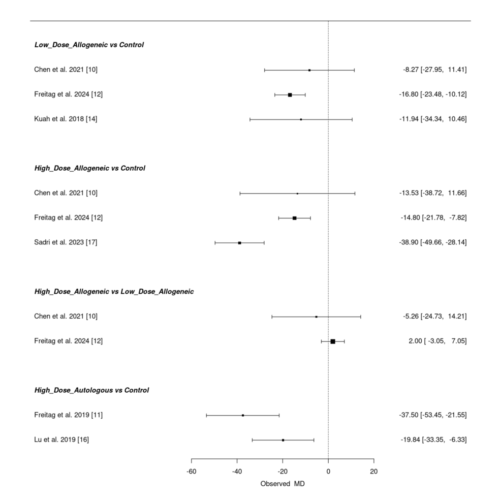 低劑量異基因AD-MSCs在Chen等(2021年)和Freitag 等(2024年)研究中僅表現(xiàn)出小幅改善(MD 分別為 – 6.46 和 – 3.24),Kuah 等(2018 年)因置信區(qū)間寬泛,療效不確定性突出。高劑量異基因 AD-MSCs 在 Sadri 等(2023 年)研究中實(shí)現(xiàn)強(qiáng)效改善,F(xiàn)reitag 等(2024 年)也觀察到顯著但較溫和的效果(MD=-5.81),但 Chen 等(2021 年)因置信區(qū)間較寬,效果存疑。高劑量自體 AD-MSCs 在 Freitag(2019 年,MD=-17.00)和 Lee(2019 年,MD=-17.13)等研究中均顯示顯著改善,即使 Kim 等(2023 年)的中等效果(MD=-5.60)仍優(yōu)于低劑量組。高劑量與低劑量異基因組的直接比較因置信區(qū)間重疊,未顯示明確劑量?jī)?yōu)勢(shì)。