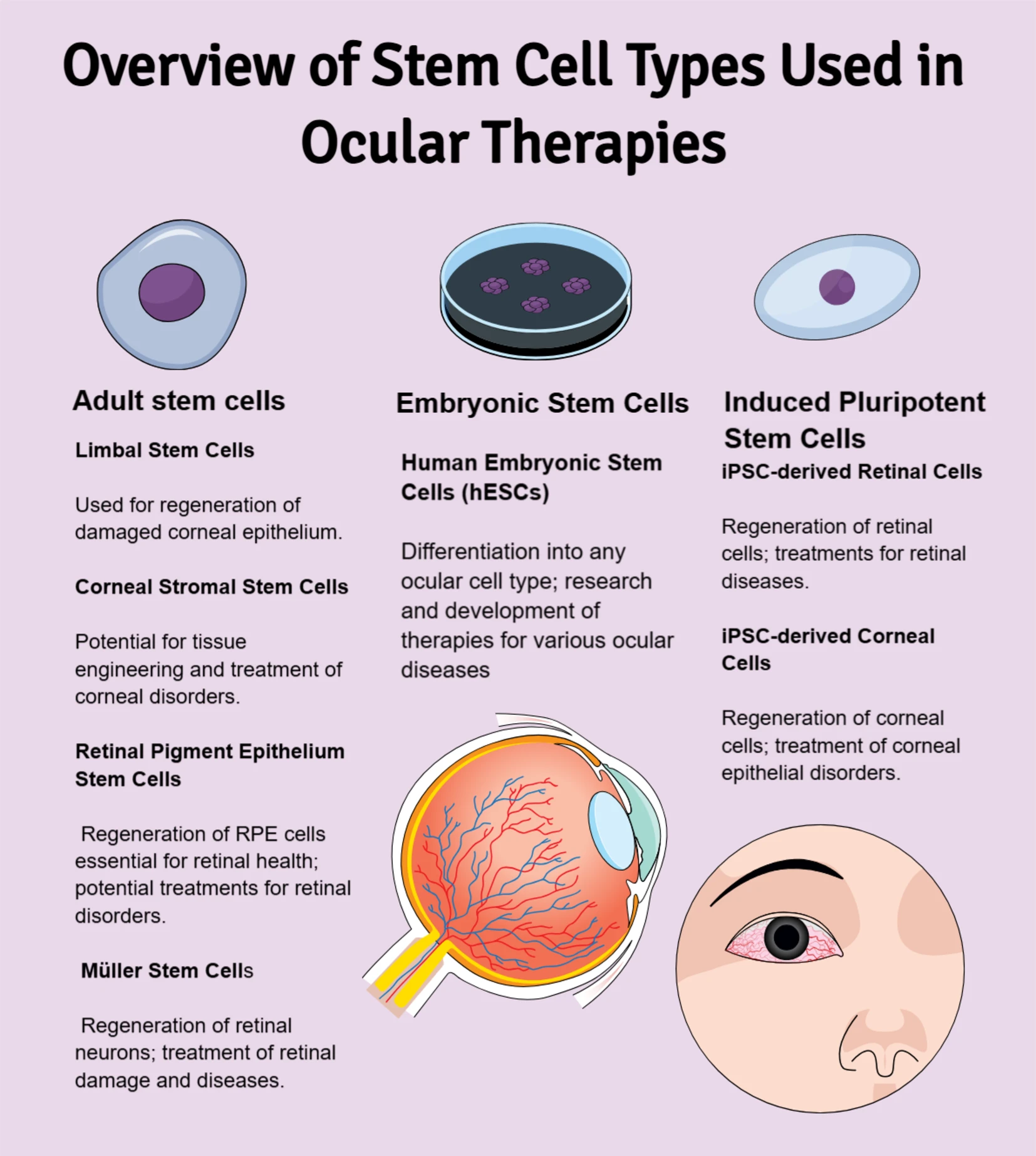 圖1:用于眼部治療的不同干細(xì)胞類型包括成體細(xì)胞、胚胎細(xì)胞和iPSC衍生細(xì)胞。這些細(xì)胞有助于視網(wǎng)膜和角膜再生,并具有潛在的治療應(yīng)用。