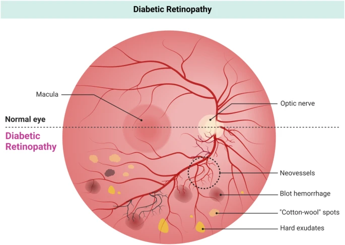 圖7:糖尿病視網(wǎng)膜病變圖示,顯示視網(wǎng)膜異常,例如新生血管、點(diǎn)狀出血、棉絨斑和硬性滲出物。對比圖突顯了正常視網(wǎng)膜與糖尿病引起的血管并發(fā)癥之間的差異。