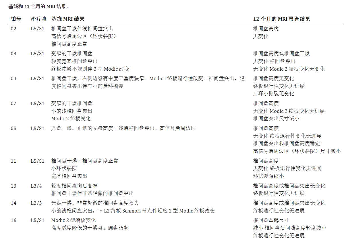 在所有九名參與者中,在12個月時拍攝的MRI顯示椎間盤高度沒有變化,九名參與者中的任何一個的終板退行性變化都沒有進(jìn)展。在三名參與者中觀察到的環(huán)狀裂隙減輕或消退,兩名參與者的椎間盤突出/突出的尺寸減小。每個參與者在基線和12個月隨訪時的MRI詳細(xì)信息顯示在表5,其中顯示了兩個代表性參與者的圖像圖8。