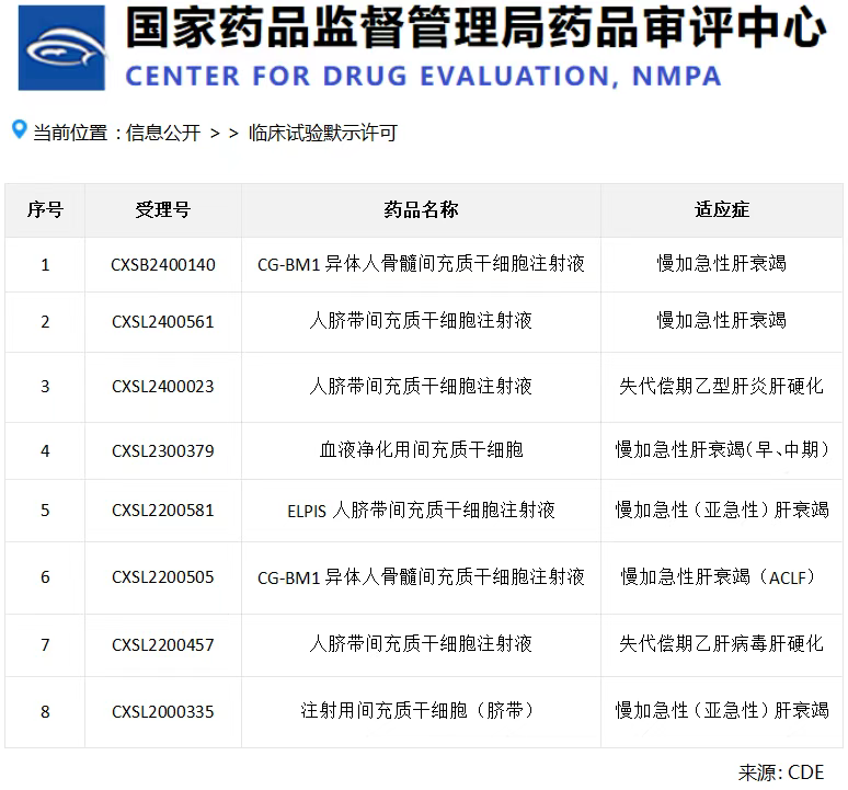 據(jù)國(guó)家藥監(jiān)局藥品審評(píng)中心數(shù)據(jù)顯示:截止2025年5月30日,國(guó)家已默示許可72款間充質(zhì)干細(xì)胞類(lèi)藥物臨床試驗(yàn),其中8款用于肝病治療(占比近12%),且6項(xiàng)直接針對(duì)肝衰竭。這不僅反映出國(guó)家對(duì)干細(xì)胞治療肝病的重視,也說(shuō)明這一領(lǐng)域已成為干細(xì)胞藥物研發(fā)的重要方向。[6]