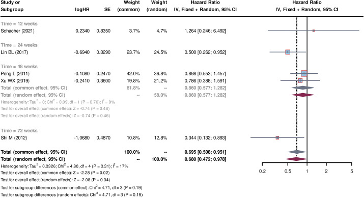 MELD評(píng)分在4周(WMD=-2.57)和24周(WMD=-4.12)時(shí)顯著降低,提示肝功能逐步恢復(fù);