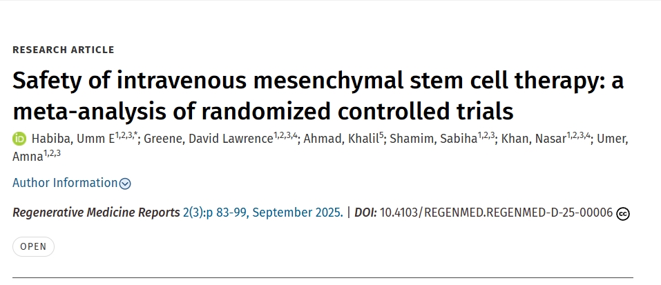 參考資料:哈比巴,烏姆 E 1,2,3,* ;大衛(wèi)·勞倫斯·格林1,2,3,4;艾哈邁德、哈利勒5;沙米姆、薩比哈1,2,3;納薩爾·汗1,2,3,4;烏梅爾、阿姆納1,2,3. 靜脈間充質干細胞治療的安全性:隨機對照試驗的薈萃分析. 再生醫(yī)學報告2(3):第 83-99 頁,2025 年 9 月。DOI: 10.4103/REGENMED.REGENMED-D-25-00006