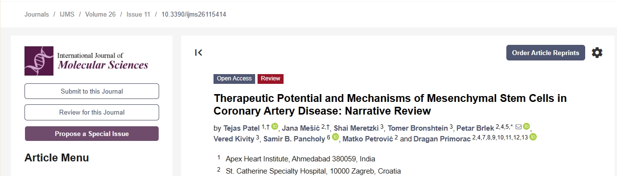 [1]Patel,T.; Me?i?,J.; Meretzki, S.; Bronshtein, T.; Brlek, P.; Kivity, V.; Pancholy, S.B.; Petrovi?, M.; Primorac, D. Therapeutic Potential and Mechanisms of Mesenchymal Stem Cells in Coronary Artery Disease: Narrative Review. Int.J.Mol.Sci.2025,26,5414. https://doi.org/10.3390/ijms26115414