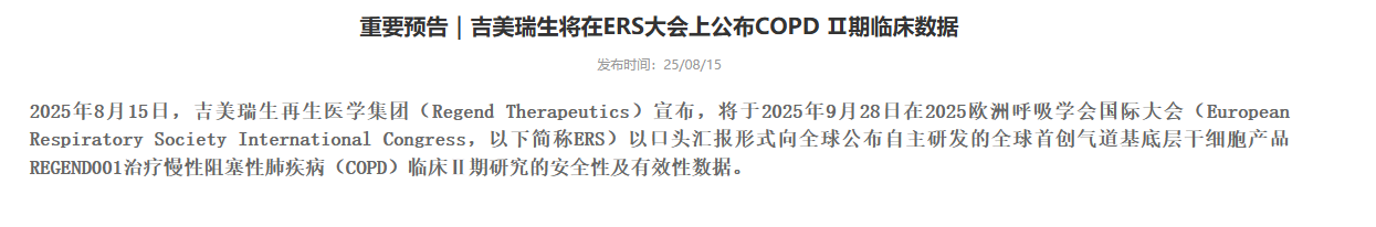 8月15日,上海瑞金落地的慢阻肺干細胞治療臨床實驗室吉美瑞生再生醫(yī)學集團(Regend Therapeutics)正式宣布,將在2025年9月28日于荷蘭阿姆斯特丹舉辦的歐洲呼吸學會國際大會(ERS)上,以口頭匯報形式向全球披露其自主研發(fā)的全球首創(chuàng)氣道基底層干細胞產(chǎn)品REGEND001,在治療慢性阻塞性肺疾?。–OPD)臨床Ⅱ期研究中的安全性與有效性核心數(shù)據(jù),為全球慢阻肺病治療領(lǐng)域帶來新的關(guān)注焦點。[9]