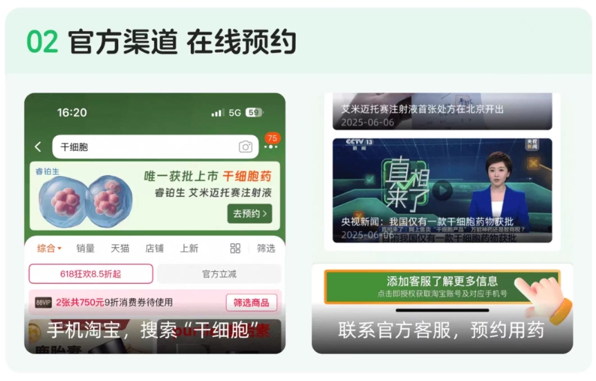 全渠道獨(dú)家經(jīng)銷權(quán):淘寶搜索入口“鉑生干細(xì)胞”直接聚合精準(zhǔn)流量,患者線上預(yù)約后至定點(diǎn)醫(yī)院(如北大人民醫(yī)院)注射,省去多級(jí)代理商環(huán)節(jié),降低渠道成本30%以上。