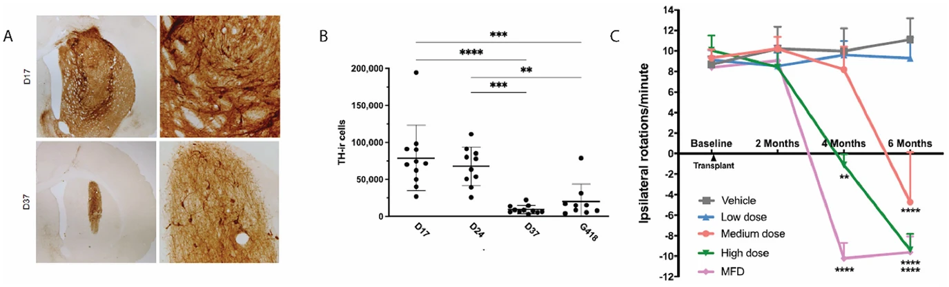 結(jié)果表明:移植物可長期存活(18–24個(gè)月),并成功向殼核及尾狀核延伸神經(jīng)支配;功能評估顯示,[18F]DOPA-PET 檢測到多巴胺生成恢復(fù)至正常水平的約50%,且運(yùn)動評分顯著改善。同時(shí),移植物安全性得到驗(yàn)證——未觀察到腫瘤形成(如菊花結(jié))、異常增殖細(xì)胞(Ki-67-)或運(yùn)動障礙,為臨床轉(zhuǎn)化奠定了基礎(chǔ)。