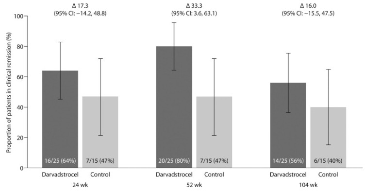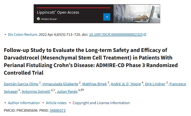 2022年,Garcia-Olmo等人的ADMIRE-CD研究評估了另一種AASC產(chǎn)品 darvadstrocel 治療克羅恩病復(fù)雜性肛瘺在104周內(nèi)的長期有效性和安全性。該報告描述了初始52周研究后的延長隨訪階段,共有40名完成52周隨訪的患者參與(25名接受darvadstrocel治療,15名接受安慰劑治療)。darvadstrocel組患者更年輕(平均38.6歲vs42.7歲),且出現(xiàn)更復(fù)雜瘺管(多個開口)的比例更高(60%vs33%)。