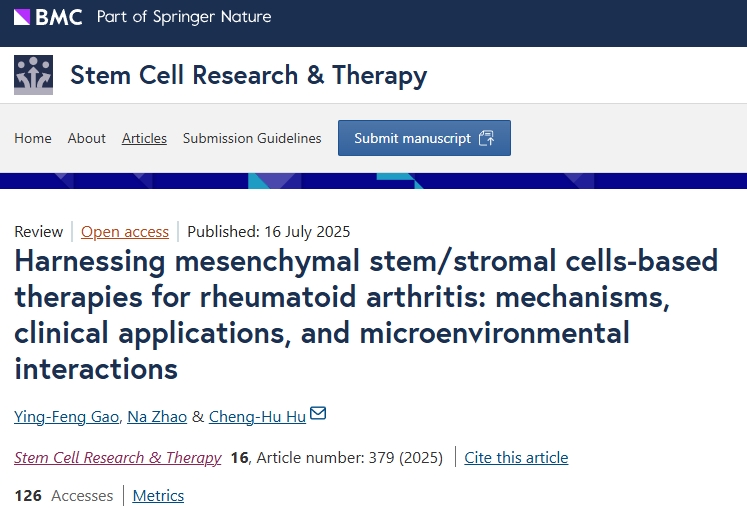 參考資料:[1]:Gao, YF., Zhao, N. & Hu, CH. Harnessing mesenchymal stem/stromal cells-based therapies for rheumatoid arthritis: mechanisms, clinical applications, and microenvironmental interactions. Stem Cell Res Ther 16, 379 (2025). https://doi.org/10.1186/s13287-025-04495-z