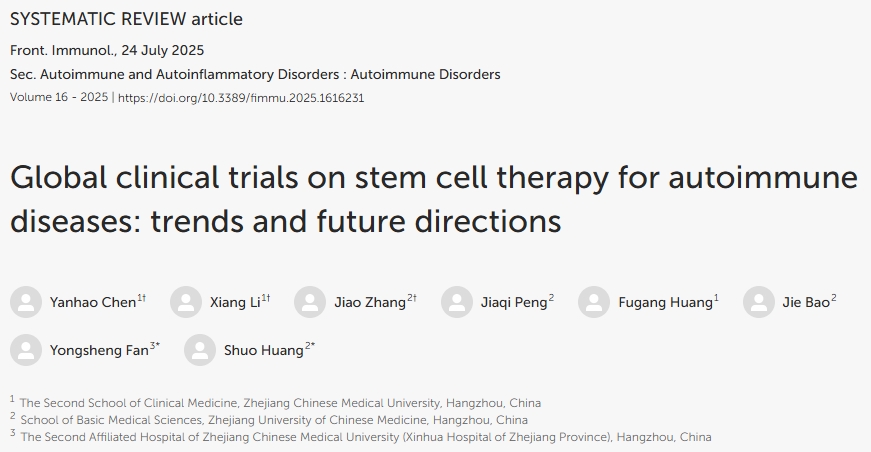 近期,浙江中醫(yī)藥大學(xué)第二臨床醫(yī)學(xué)院聯(lián)合浙江中醫(yī)藥大學(xué)基礎(chǔ)醫(yī)學(xué)院、浙江中醫(yī)藥大學(xué)附屬第二醫(yī)院(浙江省新華醫(yī)院)在國際醫(yī)學(xué)期刊雜志《Frontiers in Immunology》上,發(fā)表了一篇“全球干細(xì)胞治療自身免疫性疾病的臨床試驗(yàn):趨勢和未來方向”本研究分析了干細(xì)胞療法在自身免疫性疾病中的臨床試驗(yàn)趨勢及其挑戰(zhàn)。