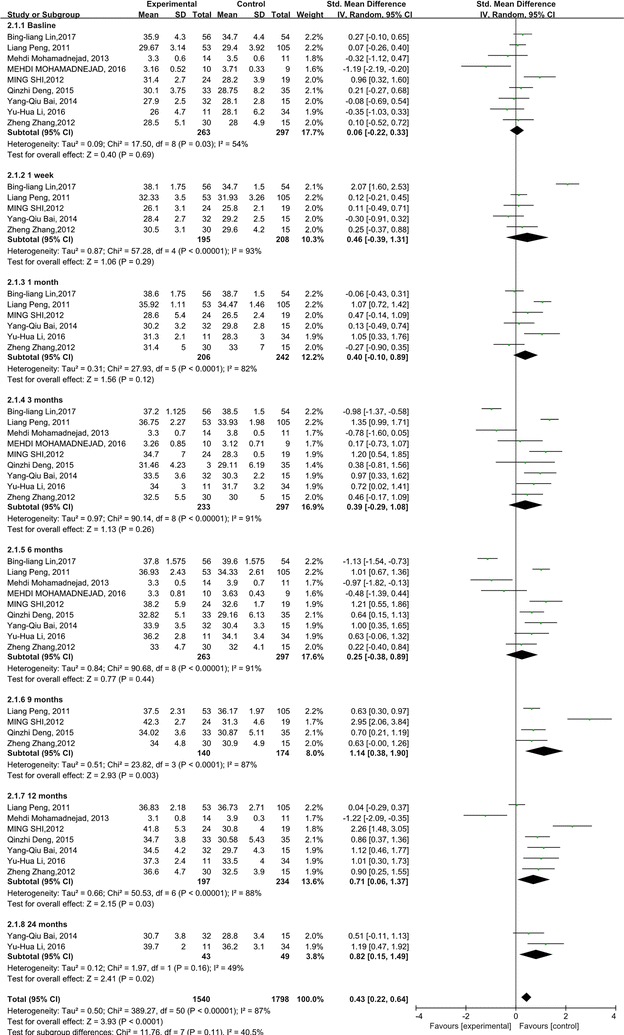 Cochrane 圖書館、OVID、EMBASE和PUBMED被檢索到2017年12月。評估慢加急性肝衰竭患者干細胞治療的隨機和非隨機研究均被納入。結果指標是總膽紅素 (TBIL)、丙氨酸轉氨酶 (ALT)、國際標準化比值 (INR)、白蛋白 (ALB) 和終末期肝病模型 (MELD) 評分。
