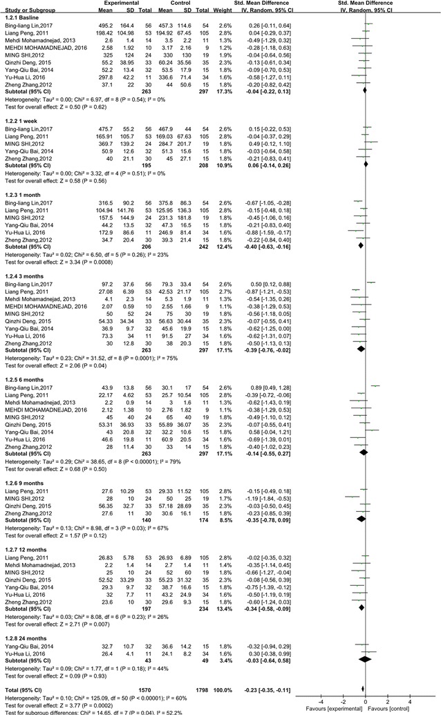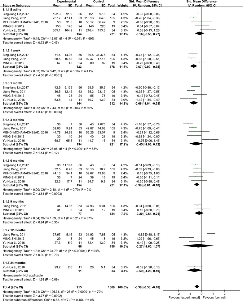 與對照組相比,干細胞治療后ALT水平顯著降低(p<0.00001)(圖5)。亞組分析顯示,干細胞治療組ALT水平也有所降低,在1周、1個月和6個月時間點均低于基線和相應對照組。干細胞治療后9、12和24個月時ALT水平無顯著差異。關于1周、6和9個月時的ALT水平,未發(fā)現(xiàn)異質性。但是,應考慮1、3和12個月時 ALT水平的異質性。但這只能通過一兩項研究來解釋。