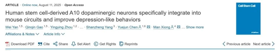 [6]Human stem cell-derived A10 dopaminergic neurons specifically integrate into mouse circuits and improve depression-like behaviorsYan, Wei et al.Cell Stem Cell, Volume 0, Issue 0