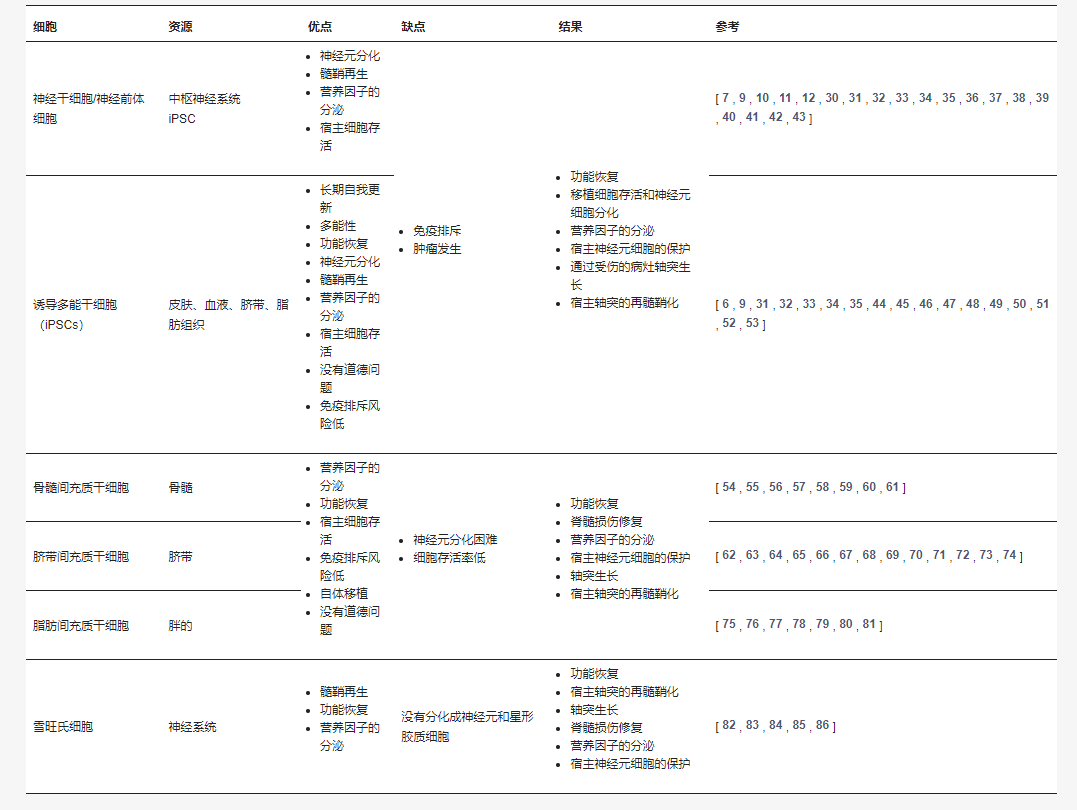 NSCs、間充質干細胞 (MSCs) 和從包括iPSC在內的各種組織收獲的雪旺細胞的移植被報道為慢性 SCI 的細胞療法。