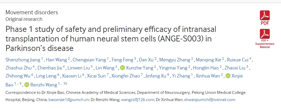 2024年5月10日,北京協(xié)和醫(yī)院神經(jīng)外科王任直教授、包新杰教授和神經(jīng)內科萬新華教授團隊從5年前啟動了一項《人類神經(jīng)干細胞鼻腔內移植治療帕金森病的安全性及初步療效的1期研究(ANGE-S003)》的臨床研究成果在國際期刊《Journal of Neurology, Neurosurgery& Psychiatry》上發(fā)表。[1]