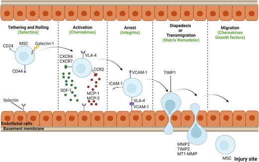 間充質(zhì)干細(xì)胞的系統(tǒng)性歸巢包括五個(gè)不同的步驟,包括黏附和滾動(dòng)、激活、細(xì)胞停滯、滲出或跨內(nèi)皮遷移以及遷移。