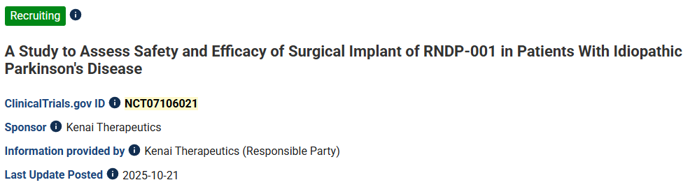 2025年12月16日,Kenai公司在帕金森病細(xì)胞療法I期臨床試驗(yàn)中為首位患者給藥。預(yù)計(jì)2026年將公布參與者的耐受性、安全性和腦成像方面的初步數(shù)據(jù)。