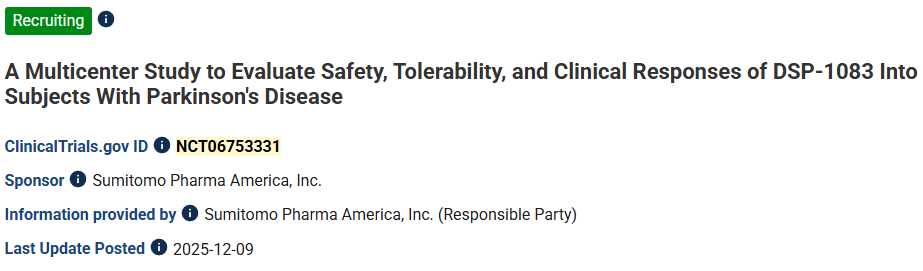 13、標(biāo)題:一項(xiàng)評(píng)估DSP-1083在帕金森病患者中安全性、耐受性和臨床反應(yīng)的多中心研究