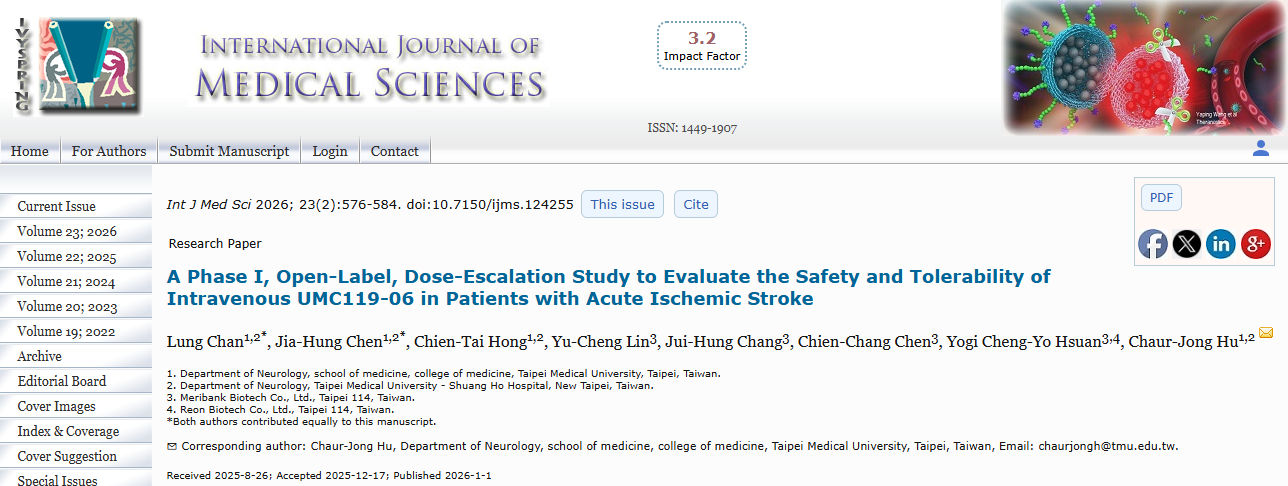 [1]:Chan L, Chen JH, Hong CT, Lin YC, Chang JH, Chen CC, Hsuan YC, Hu CJ. A Phase I, Open-Label, Dose-Escalation Study to Evaluate the Safety and Tolerability of Intravenous UMC119-06 in Patients with Acute Ischemic Stroke. Int J Med Sci. 2026 Jan 1;23(2):576-584. doi: 10.7150/ijms.124255. PMID: 41583506; PMCID: PMC12825123.