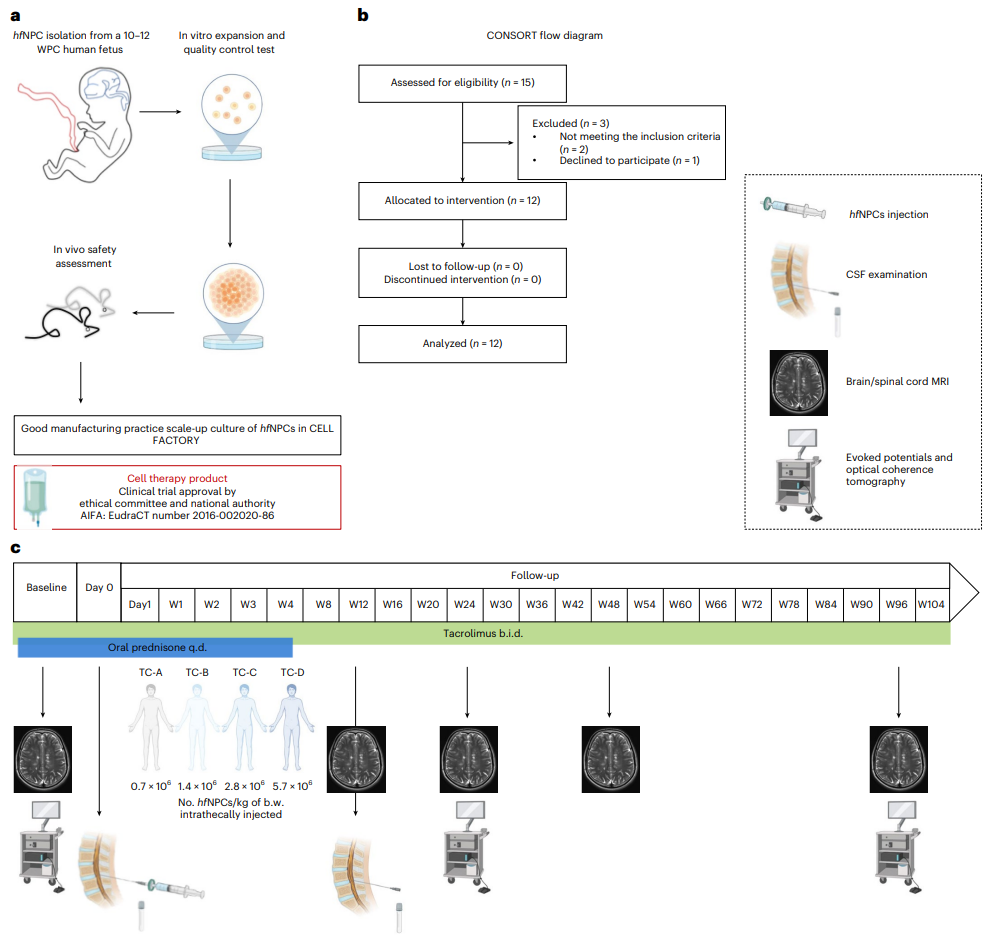 2023年1月9日,意大利IRCCS San Raffaele科學(xué)研究所等機(jī)構(gòu)的研究人員在國(guó)際頂尖醫(yī)學(xué)期刊Nature Medicine 上發(fā)表了題為:Neural stem cell transplantation in patients with progressive multiple sclerosis: an open-label, phase 1 study 的研究論文。