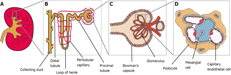B:腎單位的放大倍數(shù);C:腎小體;D:腎小球。足細胞、系膜細胞和毛細血管內(nèi)皮細胞是腎小球結(jié)構(gòu)的一部分。