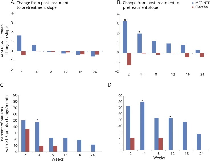 移植后ALSFRS-R斜率的變化在2周 ( p=0.110)時(shí)為+1.7點(diǎn)/月 (MSC-NTF) 和-0.4點(diǎn)/月(安慰劑),以及+0.6點(diǎn)/月(MSC-NTF) 和 -0.03 分/月(安慰劑)在4周時(shí) ( p=0.368)。8周后,兩個(gè)治療組的斜率變化相似(圖2A)。