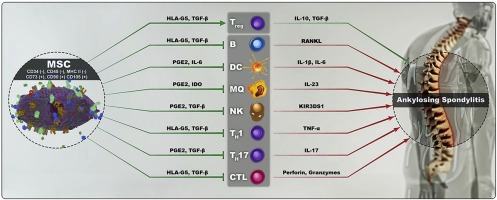盡管使用NSAIDs、糖皮質(zhì)激素、DMARDs和生物藥物治療強(qiáng)直性脊柱炎取得了相當(dāng)大的成就,但尚未建立高效無副作用的治療方式。具有大量免疫調(diào)節(jié)和再生特性的間充質(zhì)干細(xì)胞是治療免疫介導(dǎo)疾?。ㄈ?AS)的有利治療選擇。間充質(zhì)干細(xì)胞可以調(diào)節(jié)與強(qiáng)直性脊柱炎發(fā)病機(jī)制相關(guān)的免疫細(xì)胞的激活,并可以促進(jìn)后續(xù)組織損傷的再生過程。