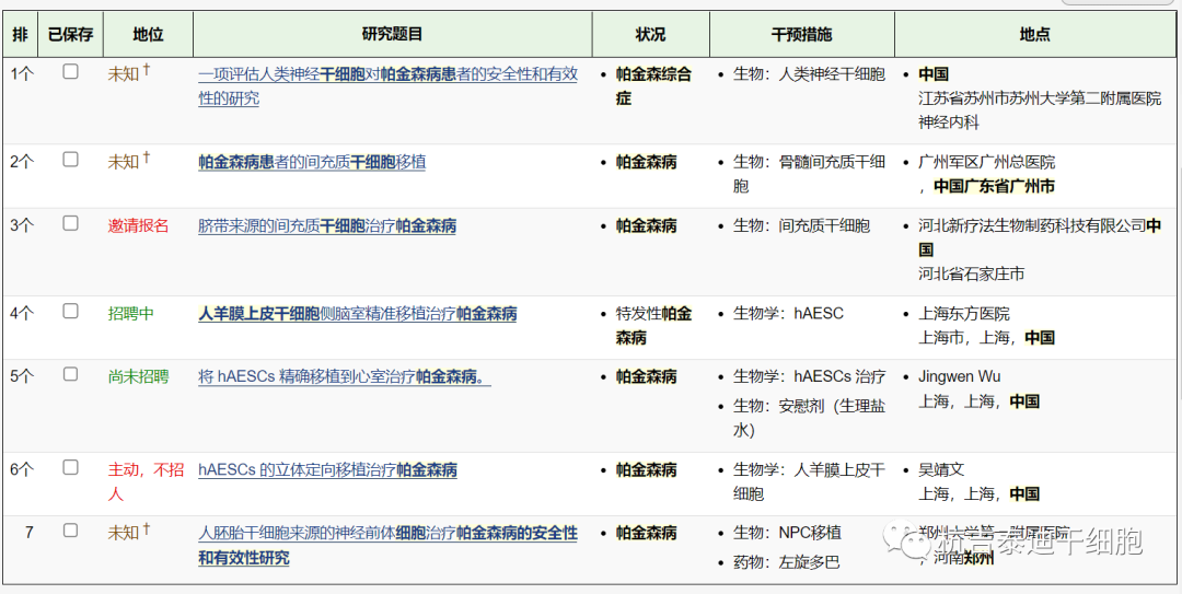 其中在中國干細胞治療帕金森病的臨床試驗有七項。