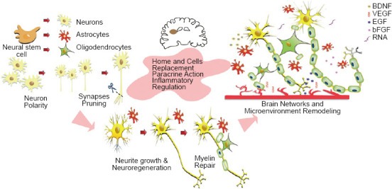 在臨床前卒中模型和人類卒中患者中,神經(jīng)干細(xì)胞治療通過(guò)產(chǎn)生神經(jīng)營(yíng)養(yǎng)和再生生長(zhǎng)因子來(lái)促進(jìn)NVU形成并促進(jìn)中風(fēng)的組織和功能恢復(fù),以促進(jìn)NSC和血管隔室之間的血管生成。血管生成可以修復(fù)網(wǎng)絡(luò)以改善大腦中的血流并改善大腦功能。神經(jīng)發(fā)生和血管生成對(duì)改善功能恢復(fù)結(jié)果具有協(xié)同作用。
